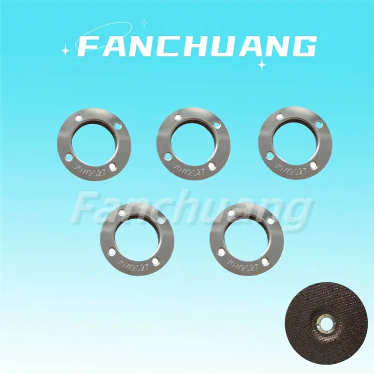 Tá poll lárnach ag baint le fáinní miotail Fanchuang do roth meilt agus gearrtha roisín, a ligeann don roth a bheith suite ar fhearsaid an mheilte uillinn go héasca agus go sábháilte.oiriúnach le haghaidh aon rothaí gearrtha agus meilte rialta, is féidir leis an neart clampála a mhéadú, an tonnchrith a íoslaghdú le linn oibriú agus saolré na dioscaí meilt agus gearrtha ar fad a mhéadú. Léiríonn na huimhreacha ar na fáinní an dáta éaga., ag meabhrú do chustaiméirí na fáinní miotail seo a úsáid laistigh den tréimhse bailíochta .Is féidir ábhar na fáinní miotail a stánphláta, ghalbhánuithe agus cruach dhosmálta. Seo a leanas na sonraíochtaí a úsáidtear go coitianta.Chomh maith leis sin is féidir cruth, trastomhas agus tiús speisialta a shaincheapadh.